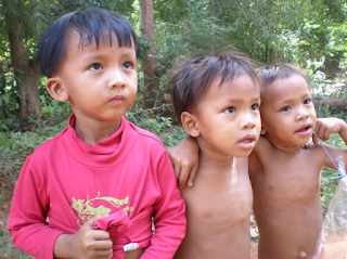 half clothed children connected somehow to the frame or the parents. Cambodia